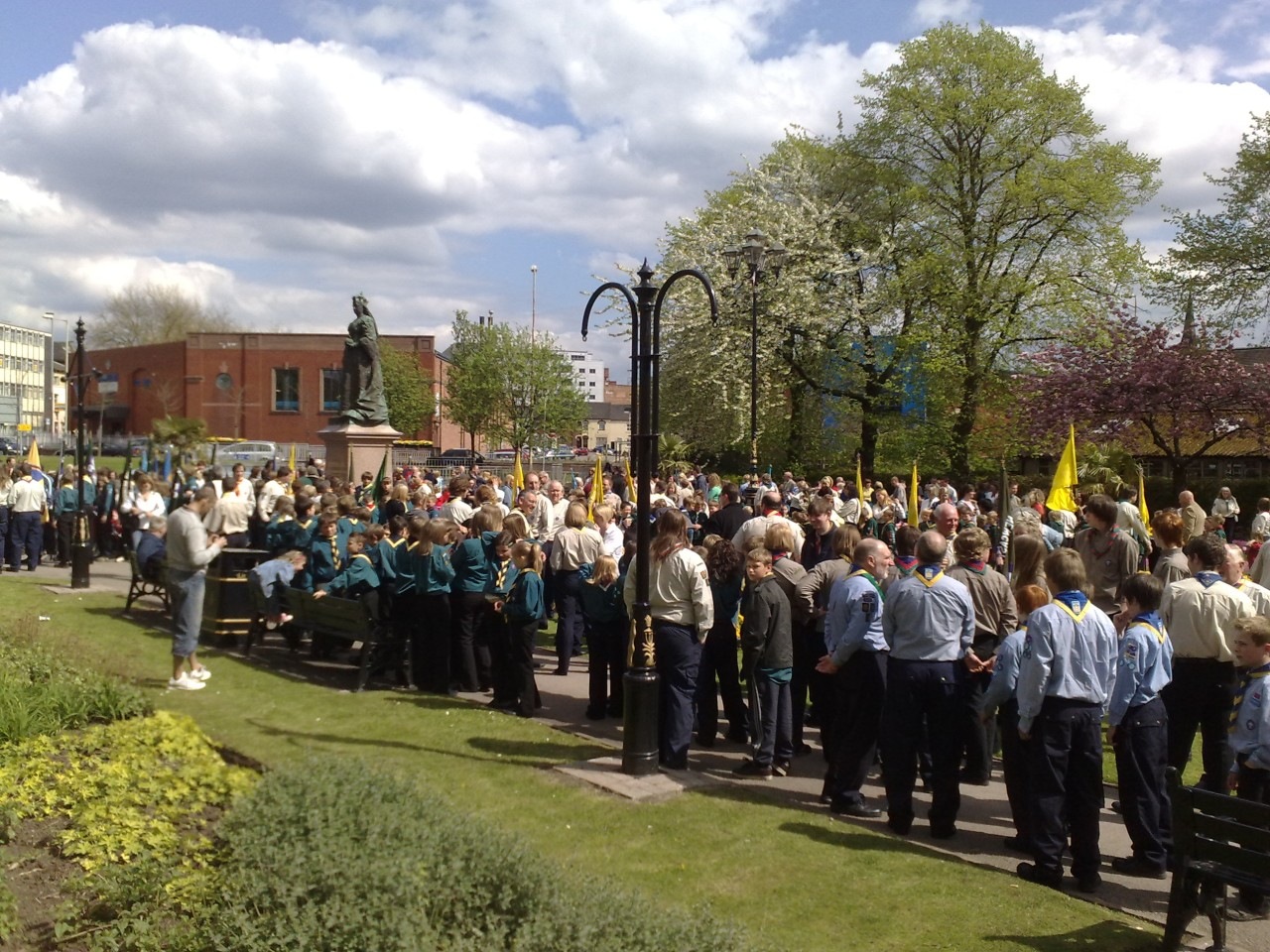 We think this is from the late 1950’s and shows some of our Cubs and Scouts along with some of the Church’s Guides with the Church Queen. We think the flag they are holding is the Troop flag we’ve just retired.